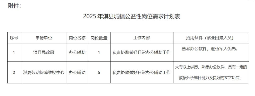 见附件《2025年淇县城镇公益性岗位需求计划表》