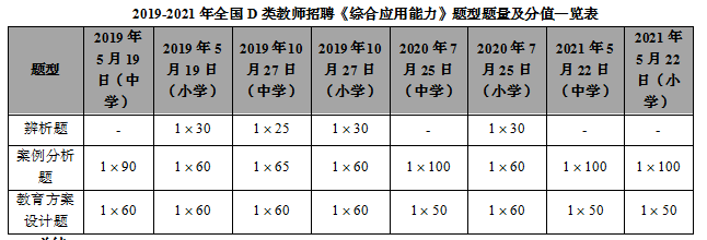 选岗指导直播 职位检索 专业分类查询 进备考刷题群 公告全文汇总 人工咨询 距离报名倒计时5天! ★报名时间:4月6日至4月12日 ★笔试时间:5月21日上午 【重大变化】考试内容变了!分类考核,分类科目,备考也要分类才能有效! 今年是海南教师招聘加入事业单位统考的第一年,大部分小伙伴对考试内容还很陌生,前面给大家讲解过公共科目—职业能力倾向测试,今天想和大家讲解的是这次考试里最难的科目—综合应用能力,为什么难呢? 教师岗《综合应用能力》都考的主观题,而且一张试卷就2-3道题,一共150分,如果是一张卷子2道题,那平均每道题75分,答错一道题,就瞬间拉开一半的分差,而且这次统考,笔试和面试是6:4,也就是笔试占的比例很高,所以在笔试这里拿高分,面试不出错那今年入编就稳了。 那话不多说,现在就开始和小编一起学习统考里教师岗综合应用能力D类卷的考情,怎么考?考什么?题型题量怎么分布? 《综合应用能力—D类》是针对中小学和中专等教育机构的教师教师岗位公开招聘工作人员而设置的考试科目,目的是测查考生的的综合运用教育学、心理学等相关知识和技能,分析、解决中小学教育教学问题的能力。 从20219年开始,这个科目分为小学教师岗位和中学教师岗位两类。 试卷主要题型包括辨析题、案例分析题及教学方案设计题等。一张卷子2-3道题,满分150分,案例分析题及教学方案设计题是必考试题的题型,下面是历年题型题量的变化趋势:浙江省综合应用能力a卷