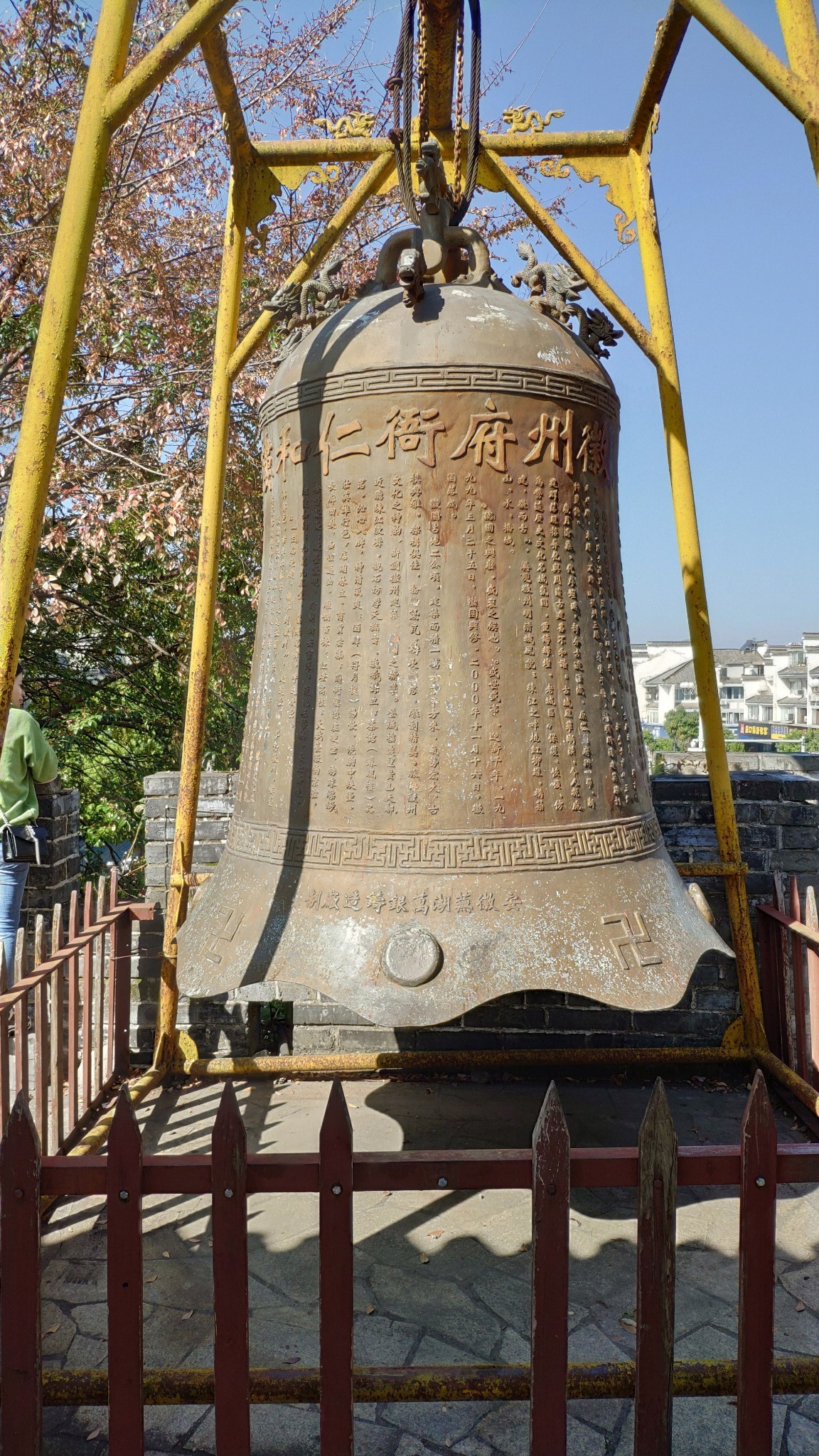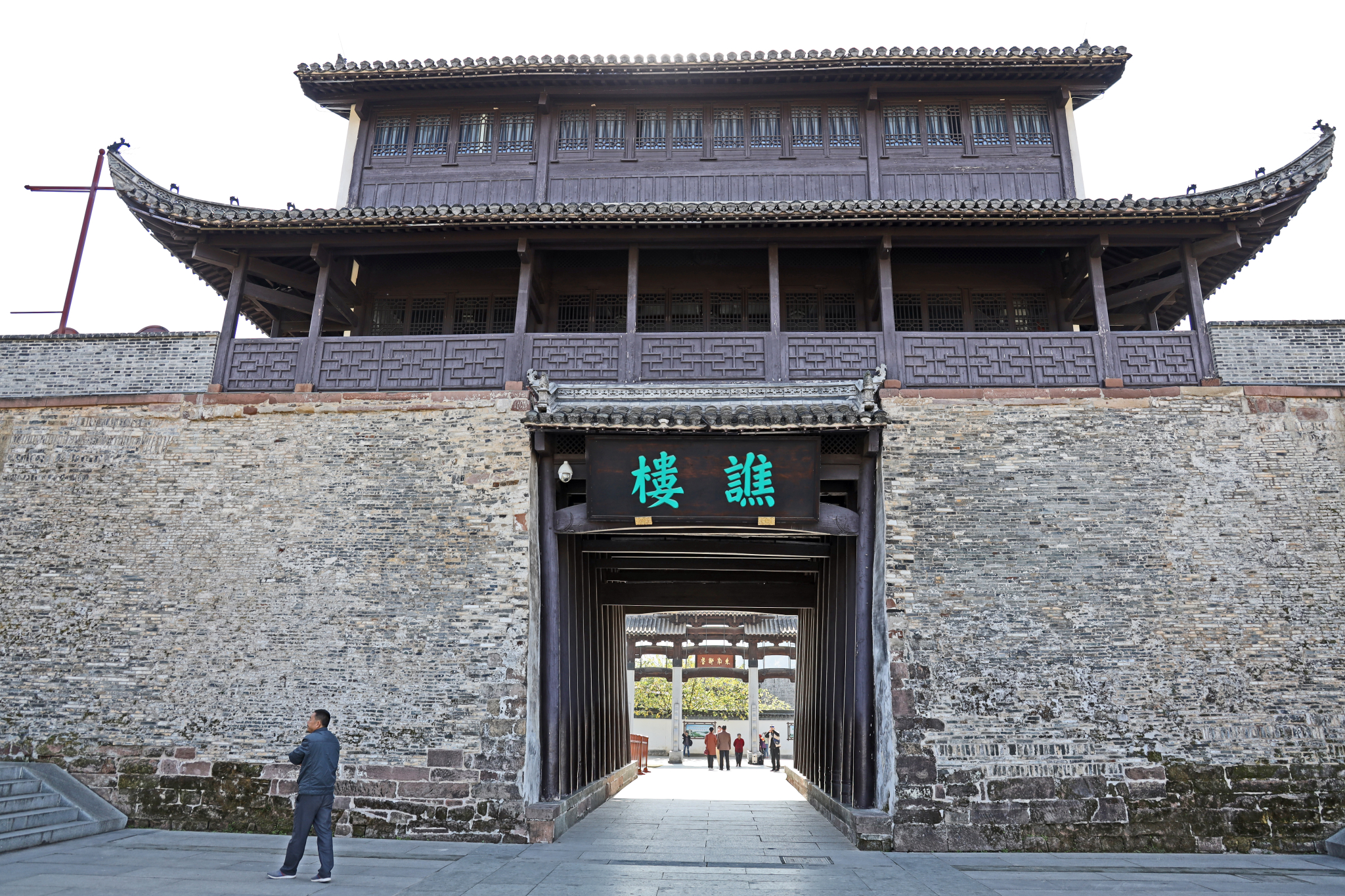 【 南谯 楼】南谯 楼,始建于隋末,为歙州(今 )人汪华吴王府外子城的正门门楼。 南谯 楼是古代夜间向人们报时的地方,打更的鼓声就是从谯楼传向四面八方的。 南谯 楼三重三开间,高约20米,宽约15米,进深约10米。砖木结构,悬山顶,重檐高脊,紫墙青瓦。下为门厥,门阙宽***米,左右各有木柱13根。每根柱围1米余,每柱均呈10度左右斜倚墙壁,用以支撑大梁。1997年,国家文物局拨款重建,并基本保持了木构清代风格,门阙为宋代风格。