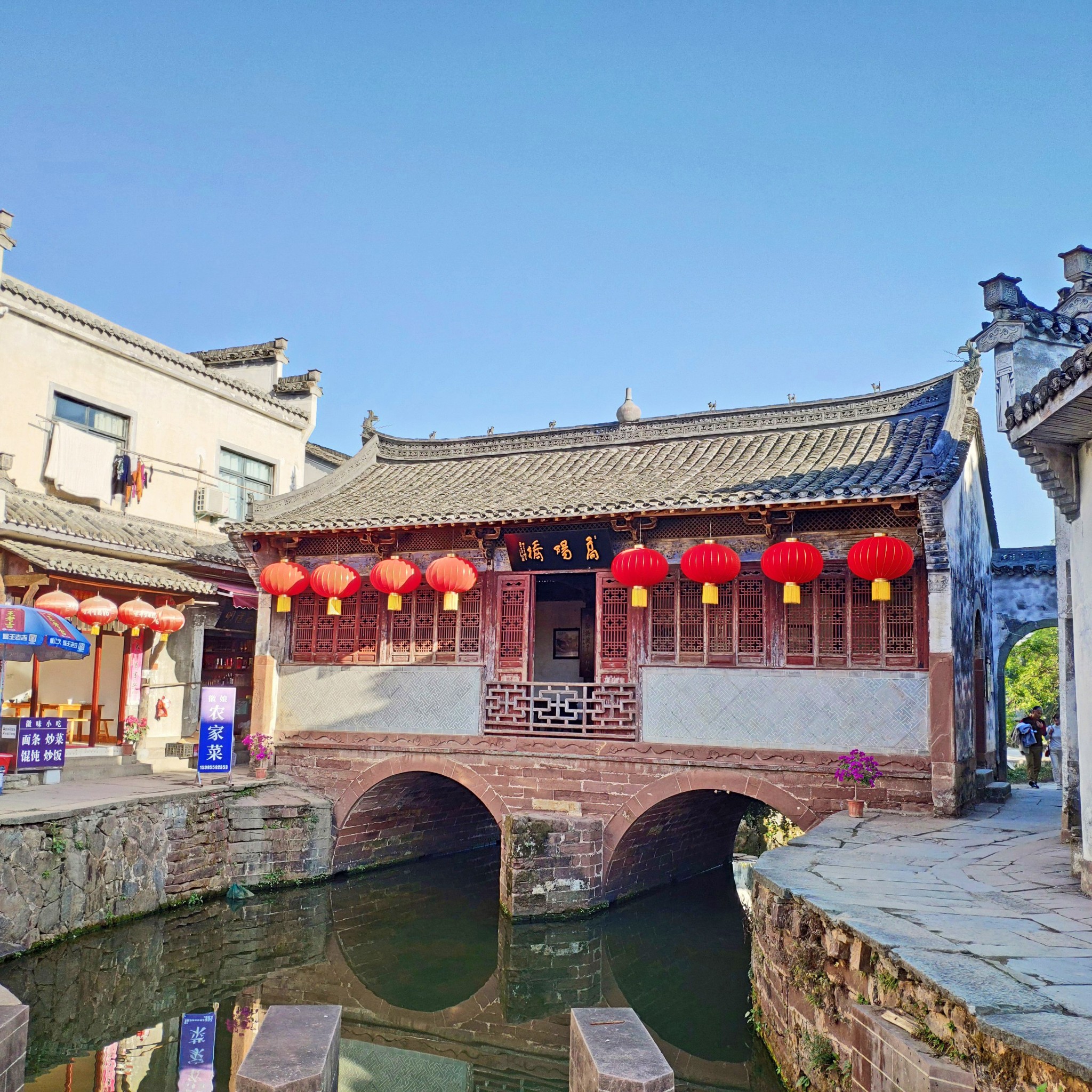 【 高阳 桥】高阳 桥连同建于其上的廊房现已改建成茶室,置身桥上,冲一盅 毛峰,边细细品茗,边浏览水街的景色,边欣赏旅游部门组织的歌舞或戏曲演唱,真是一种难得的享受。