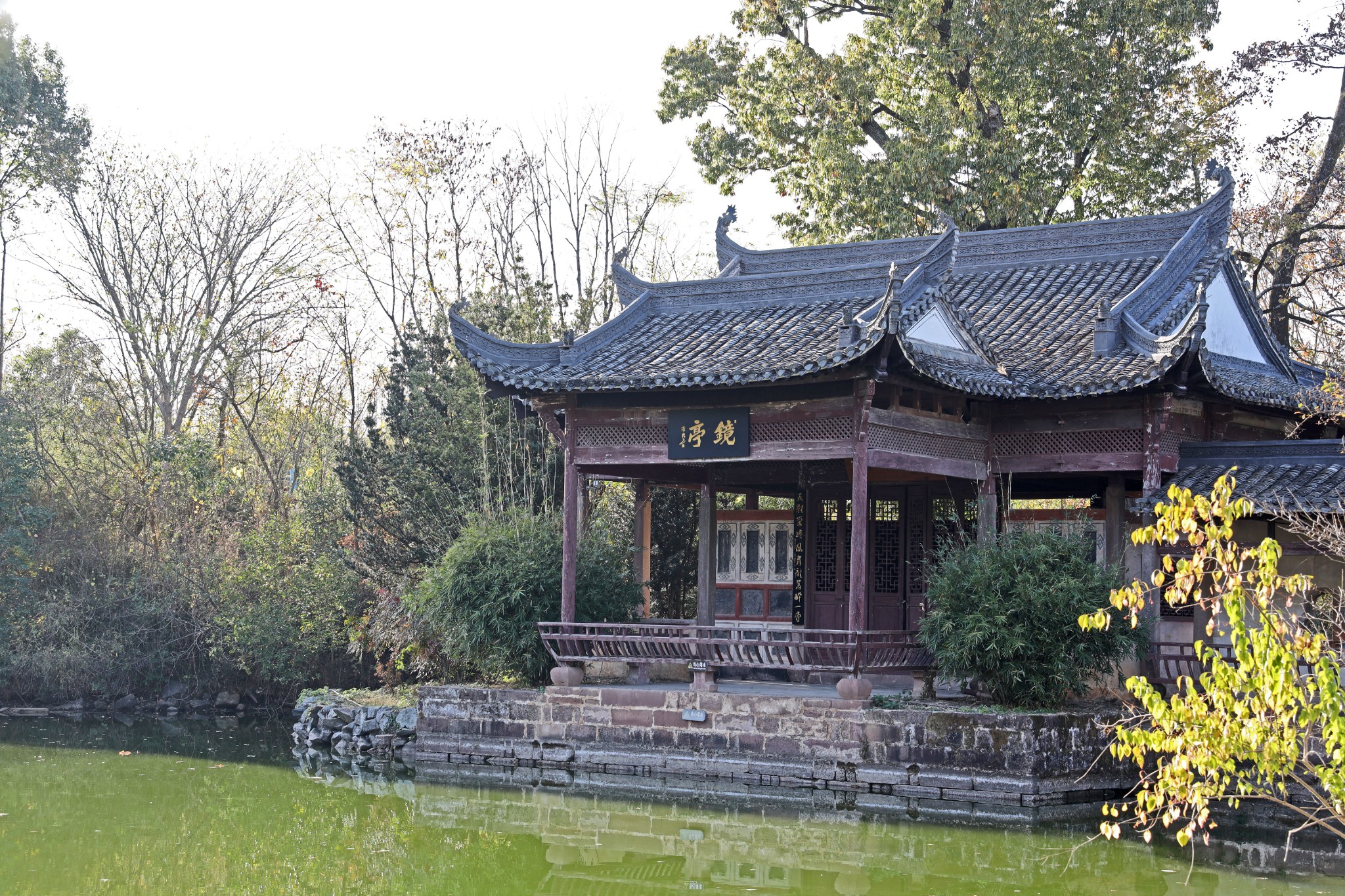 镜亭藏碑镜亭内四壁用 大理 石建筑,上嵌历代名家书法长刻石18块。当中6石较短,刻朱熹、苏轼、倪云路、赵孟頫、文征明、查士标6人的行草。旁12石较长,刻米芾、蔡襄、黄庭坚、董其昌、祝允明、罗洪先、罗牧、程京萼、陈亦禧、八大山人的行草书和陆岳的篆刻等,石质细腻,石刻精美,铁画银钩,龙蛇隐壁,气势恢宏。一室之内竟珍藏历代书法大家世擘之精品如此之多,简直像一个书法珍品的博物馆,可见徽商经济的繁荣和由此带来的文化昌盛。据悉十年动乱时期,此亭发作了牛栏,才使这些无价之宝幸免于难。