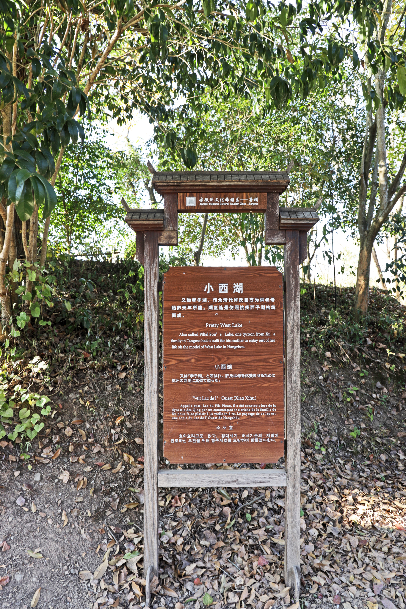 【小西湖】相传,清初 许氏有一位富商在苏浙皖赣一带经营36间当铺,时称36典。其母想往 杭州 西湖游览,苦于山高路远,年老体衰不便成行。于是这位孝子不惜巨资在村边挖塘垒坝,模拟西湖景致,修筑亭台楼阁、水榭长桥,湖堤遍植檀花和紫荆,供母娱乐,并报答乡邻相助之恩。田园内遍植檀花,又有一泓小溪缓缓绕流,取《诗经》【坎坎伐檀兮,置之河之干兮】之意而名曰【檀干园】。现修葺一新的园林,由94岁高龄的原 上海 博物馆馆长顾廷龙老先生于1997年4月题写了【檀干园】三字,古朴苍劲,题字数月,顾老先生即飘然仙逝,令人扼腕长叹。