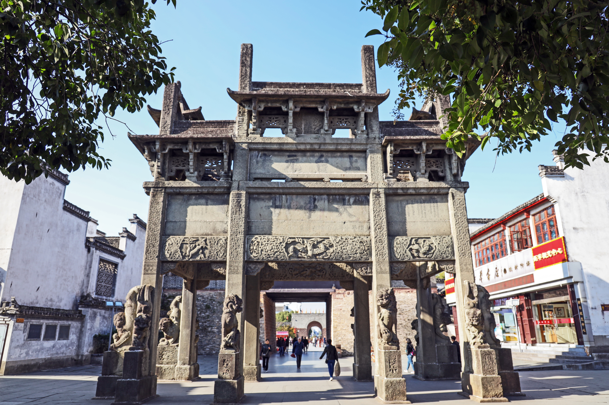 牌坊群【 牌坊群】位于 安徽 省 村东大道上,为明清时期古 建筑艺术的代表作。 的七连座牌坊群,不仅体现了徽文化程朱理学【忠、孝、节、义】伦理道德的概貌,也包括了内涵极为丰富的【以人为本】的人文历史,同时亦是徽商纵横商界三百余年的重要见证。每一座牌坊都有一个情感交织的动人故事。乾隆皇帝下 江南 的时候,曾大大褒奖牌坊的主人鲍氏家族,称其为:慈孝天下无双里,衮绣 江南 第一乡。1996年, 牌坊群被国务院公布列为第四批国家重点文物保护单位。