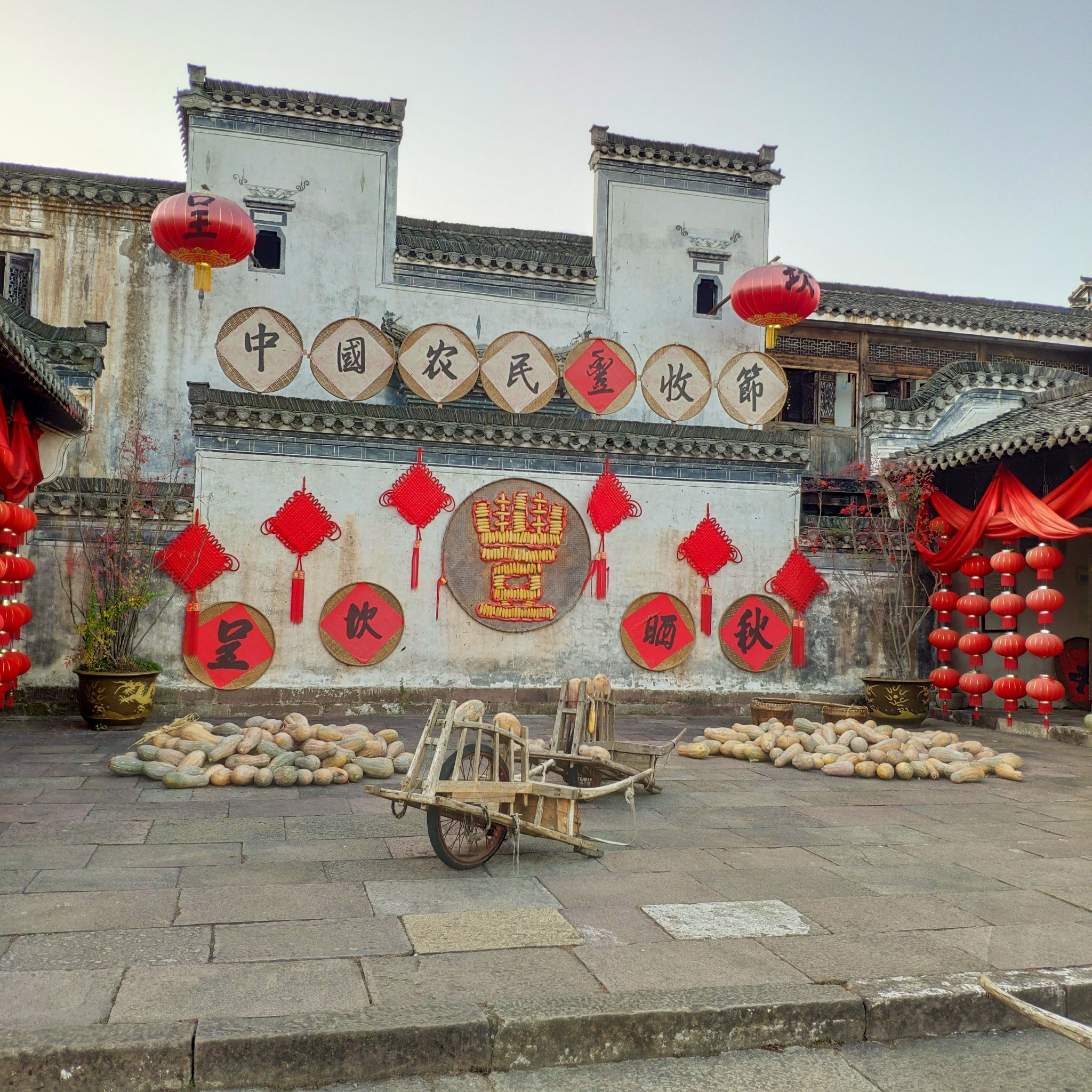 呈坎 【 中国 农 民丰 收节】一幅美丽的画卷。大红灯笼高高挂, 中国 结坠于黛瓦白墙上;丰收的果实堆于地上、挂在架上、盛放在晒匾里;还有用丰收果实组成的各种造型的标语、造型图案,充分展示出农民喜获丰收的愉悦心情。这一切与优美的自然景观、人文景观交融在一起,更加增添一种特殊的美色。