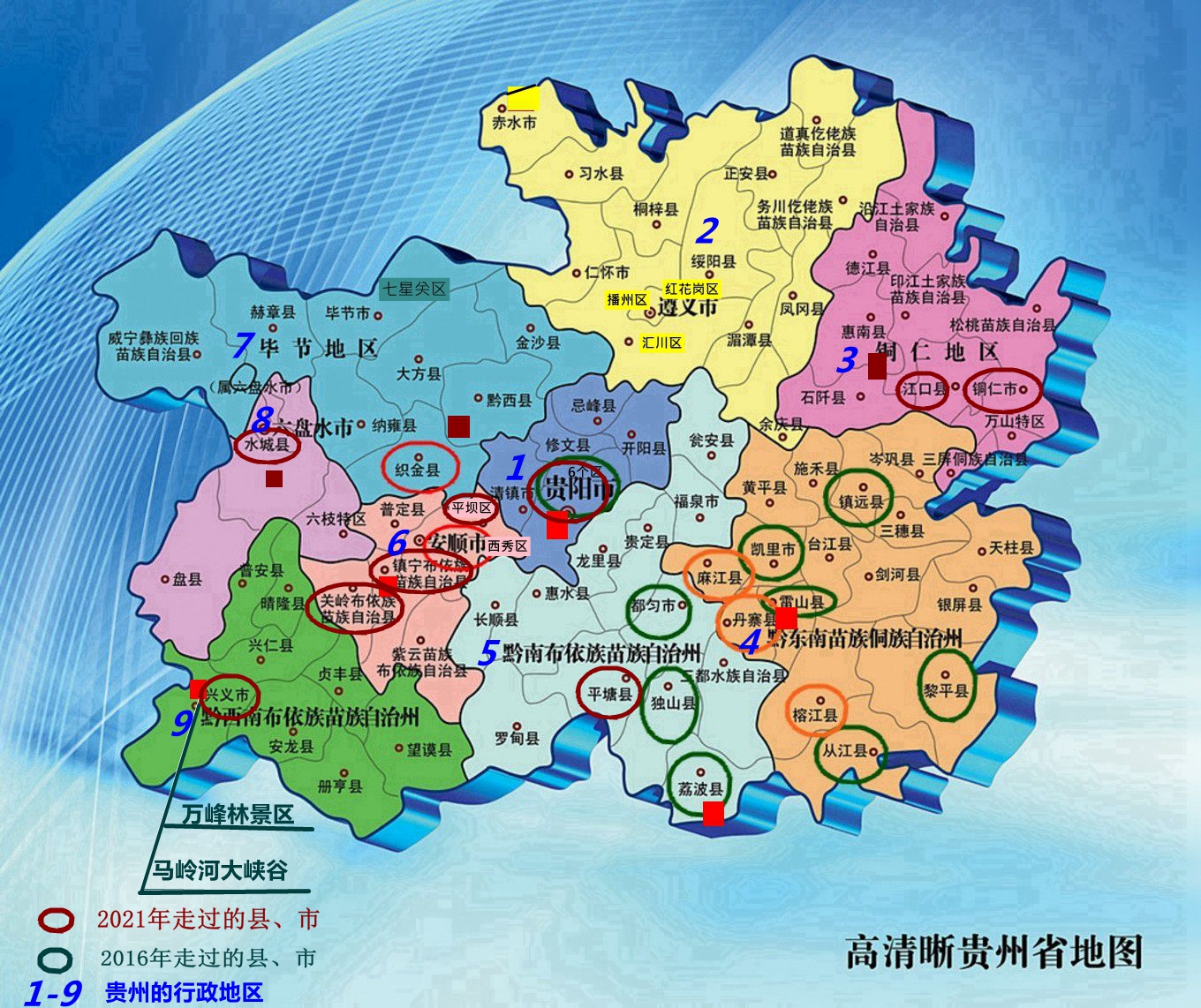 这位朋友,你想1月底去自驾游玩,下面图中绿色圆圈是你想去的地方。涵盖了省9个行政区的6个地区(市)。首先我想说的是,旅行自由行一定是要按照地图来规划行程,是个“三里无平地”的山区地貌,虽然说现在高铁发展很快,很多地方有高铁站,但是还是“天无三日晴”的地方,普通铁路的晚点率很高的,甚至在雨季取消列车也很正常。所以,去靠公共交通的飞机、火车、高铁、客运旅行时间很辛苦和有耐心的事情。行程基本是个顺序问题,时间上要做出充足的预留时间:因为有火车晚点问题,有车次时间衔接问题。因此,可以给你提供行程路线,旅行时间你根据路上的情况自行增减。是个旅游资源大省,在9个行政地区内值得游览的景区有45个,在我看来,下面这20多个景区(点)都是不容错过的优质旅游资源。