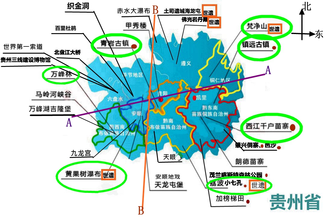 9布依族苗族自治州。西线游: 1,7市, 8市 ,6市,9 布依族苗族自治州 。D1, ,甲秀楼,省博物馆(最有民族特色的博物馆)。宿D2,,青岩古镇5A。白宫。宿。D3,,世界最美喀斯特溶洞-洞5A。宿县城。D4,,世界10大观鸟基地-草海。 宿。(百里杜鹃时间不对省略) D5, 市 , 世界第1高大桥 杭瑞北盘江大桥(高565米!)。宿市。D6, 市 , 目前世界最长索道 (近万米,可以选择坐半程。) 宿市。D7, 市 , 三线建设博物馆景区。共和国不能忘却的历史。宿。D8-9, 市,黄果树瀑布。但是此时为枯水期。不建议去。宿。D10-11, 布依族苗族自治州市万峰林景区 -4A,万峰湖旅游景区 -4A。宿万峰林景区。D12, 布依族苗族自治州市 马岭河峡谷景区 -4A 。推荐加1天去。宿市或万峰林。返回出发地。 原则上根据地图的位置集中一个地区游玩;这样即省旅途的时间,不治至于盲目瞎跑,又不漏掉同一个地区的景点。同时也节省大交通费用(机票、火车票),不会因为哪个景点因为前一次去没去到而重复去同一个地方。所以,你的行程是南北游A线以南的南线游加市。D1, ,甲秀楼,省博物馆 (最有民族特色的博物馆)。宿D2, 青岩古镇5A。白宫。宿。D3-4,市,世界文化遗产梵净山5A。(流出机动1天,最好是晴天去。雨天不要去。)宿或市。 D5-6, 苗族侗族自治州县古镇。非常值得一去的古镇。宿2晚。D7-8,苗族侗族自治州县 西江千户苗寨-4A (苗族景区代表)。宿苗寨。D9-10, 布依族苗族自治州县,世界文化遗产 小七孔-5A 。大七孔不推荐。宿县1晚,D10天晚上宿。D11,