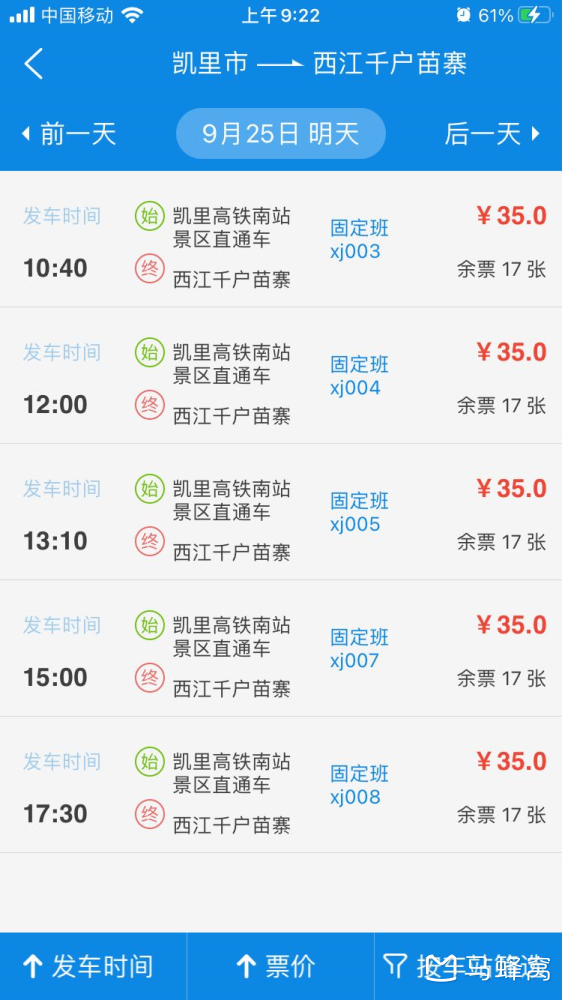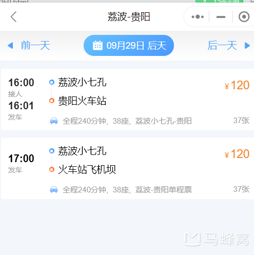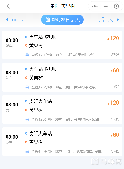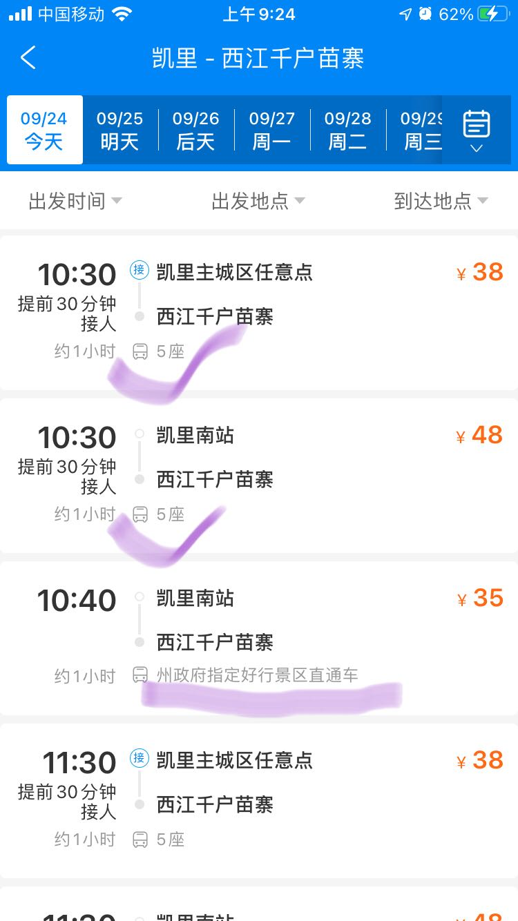 黄果树到苗寨的交通要看前日黄果树的行程安排,但都是动车到南站+景区专线车到苗寨的方式:如果前日黄果树是从当日往返的,那么前日晚就是住宿在的,可以第二天早上在北站坐动车1小时多一点到南站;如果前面黄果树是分两天走完,中间是住宿在黄果树的,那么第二天下午要先坐黄果树客运站到西站的专线车35分钟,再坐动车到南站;之后的交通都是一样的,主要有下面两种方式:1、南站直接坐景区专线车1小时到苗寨,购票公众号或者APP汽车票,搜-西江,选择西江千户苗寨那项,票价35元,目前全天车次见下面第一张截图。2、下面第二张截图来自APP中汽车票里面的景区巴士,里面标注为5座车的相当于拼车,发车时间、地点更灵活,价格略贵一点。