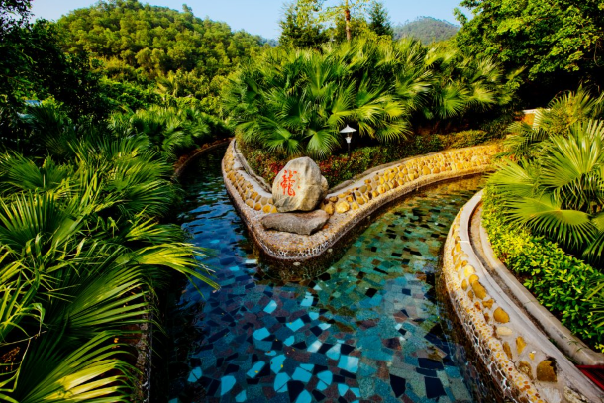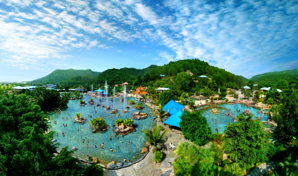 园区温泉建造风格融合了中国传统文化和地方文化特色,共建大、中、小温泉浴池80多个,有目前世界最大的温泉瀑布群、温泉浴池、温泉舞台及独具特色的“四屏堂”和“泉来运转”。温泉水质晶莹幼滑,含有氟、氢、硫等多种有益于人体健康的矿物质和微量元素,被誉为“世界温泉养生基地”。