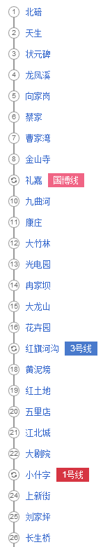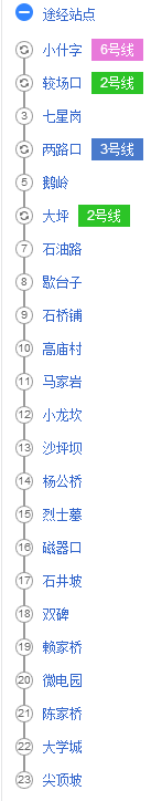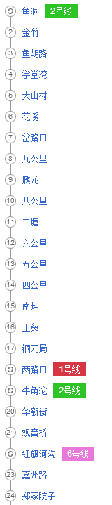 彩色方框中的数字表示可以在这个站换乘。地铁二号线:起于*** 渝中区较场口,止于市*** 鱼洞,跨越四个行政区,辐射九个片区,衔接六大行政区,沿途站点: