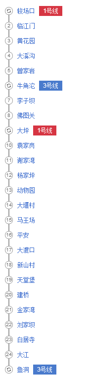 地铁三号线:南起鱼洞,北至江北机场及江北环城北路,全长约60公里,工程一次设计,分三期实施建设。一期工程为二塘至龙头寺,线路起于南岸国家级经济技术开发区的二塘,经菜园坝长江大桥、嘉陵江渝澳大桥至主城区北部新区的江北(火车)客站(渝怀铁路新客站站地);二期工程从龙头寺到江北机场,并延伸到机场远期航站大楼、空港开发区支线(两路中学到环城北路);延伸段(即三期工程)从二塘向南延伸至鱼洞。